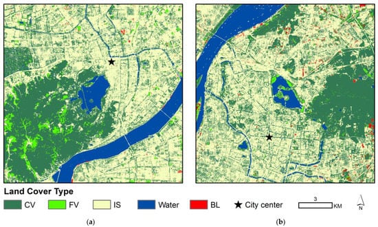 The land cover classification was derived from the pre-processed Sentinel-2 images using the maximum likelihood supervised classification method. The land cover classification system developed by Cadenasso et al. [48] was adopted to classify the land cover into five categories, namely coarse-textured vegetation (CV), fine-textured vegetation (FV), impervious surface (IS), bare lands (BL), and water. The detailed information of these categories is shown in Table 2. The accuracy of classification was evaluated using 500 random points located in each classified land-cover map with reference to the ground-truth data in Google Earth. The results showed that the overall accuracies [49] of the classifications were 91.20% for Hangzhou and 91.67% for Nanjing. The kappa coefficients were 0.878 for Hangzhou and 0.883 for Nanjing.