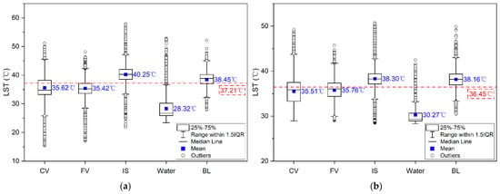LST of land cover categories in (a) West Lake and its neighboring areas in Hangzhou, and (b) Xuanwu Lake and its neighboring areas in Nanjing (CV: coarse-textured vegetation; FV: fine-textured vegetation; IS: impervious surface; BL: bare lands; Water: water).