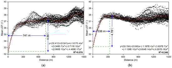 The scatter diagram has been widely employed for qualitatively discussing the relationships between LST and the distance to the water bodies in previous studies [33,61]. In addition, the affecting scale was acquired by seeking the stationary point of the fitting function of the scatter diagram [4].