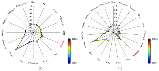 Radar diagrams showing the standardized coefficients of the multiple linear regressions for (a) West Lake and its neighboring areas, and (b) Xuanwu Lake and its neighboring areas. The significance levels of the coefficients are all less than 0.05 except for DEM (sig. = 0.058) from the 700 m model in Hangzhou, FV_AI (sig. = 0.067) from the 700 m model in Nanjing, FV_AI (sig. = 0.063) from the 900 m model in Nanjing, FV_PD (sig. = 0.062) from the 1200 m model in Nanjing and BL_PD (sig. = 0.050) from the 1400 m model in Nanjing.