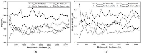 Mean (a) patch density (PD), and (b) SHAPE_MN at different distances to the lakes.