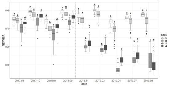 Median values, 25th and 75th percentiles of Normalized Difference Water Index with a narrow near-infrared band (NDWI8A) temporal profiles for control (C1 and C2) and study sites (L1, L2) for each of the dates reported in Table 1. Letters denote statistical significance between control and wind-damaged sites index values (p-value < 0.05). The dash line separates pre and post-Vaia dates.