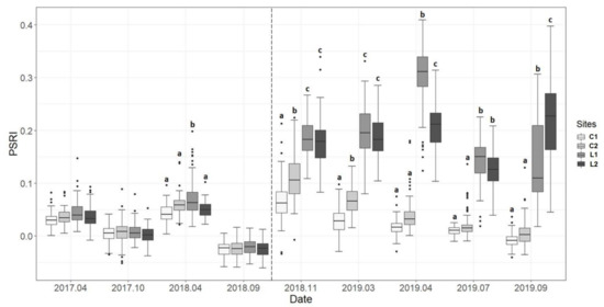 Median values, 25th and 75th percentiles of Plant Senescence Reflectance Index (PSRI) temporal profiles for control (C1 and C2) and study sites (L1, L2) for each of the dates reported in Table 1. Letters denote statistical significance between control and wind-damaged sites index values (p-value < 0.05). The dash line separates pre and post-Vaia dates.