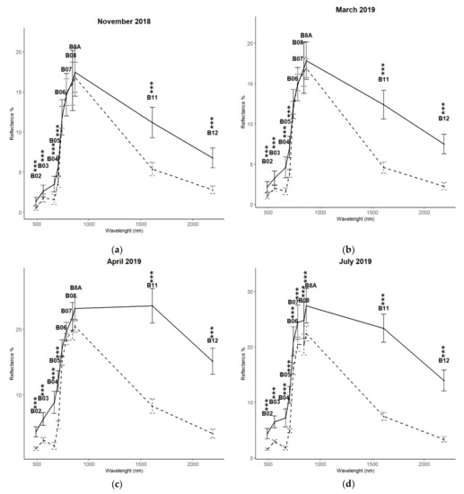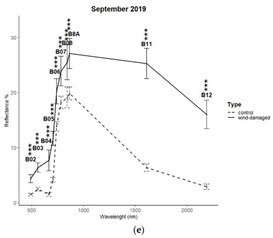 From July 2019, a significantly higher reflectance between the red-edge and NIR region (B05–B8A) was also registered in wind-damaged sites rather than in controls. In September 2019, the gap between the two signatures in the NIR had a further growth; B8 and B8A reflectance was 25.3% and 16% in wind-damaged sites and 6.4% and 2.9% in controls. In July and September 2019, a slight absorption in the red region reappeared, as an inflection point is visible in B03.