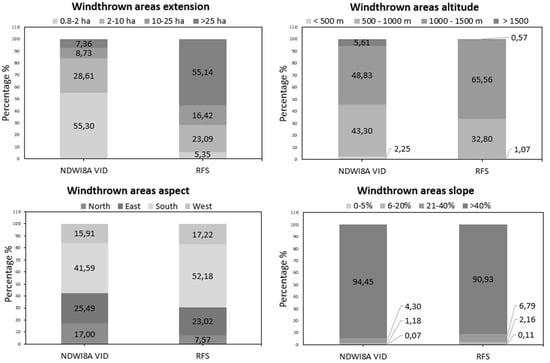 Frequency percentage of windthrown areas estimated by NDWI8A vegetation index differencing (VID) and regional forest service (RFS) methods in extension (0.8–2 ha, 2–10 ha, 10–25 ha, >25 ha), elevation (below 500 m, 500–1000 m, 100–1500 m, above 1500 m a.s.l.), aspect (north, east, south, west) and slope classes (0–5%, 6–20%, 21–40% and >40%).