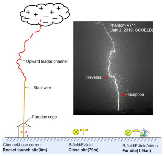 - Fan, Y.; Lu, G.; Li, X.; Zhang, H.; Jiang, R.; Liu, M.; Qie, X.; Zhang, Y.; Zhang, Y.; Lu, W.; et al. Measurements of burst of magnetic pulses during the initial continuous current in rocket-triggered lightning. J. Geophys. Res. Atmos. 2019. [Google Scholar] [CrossRef]