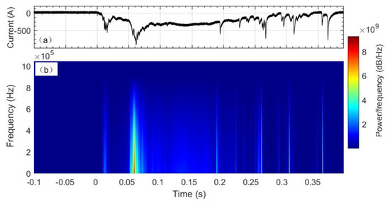 The lightning current was measured with a 1-mΩ coaxial shunt at the bottom of a lightning rod. The power spectrum of the channel-base current is shown in Figure 2. The power spectrum peak of the current waveform approximately reached 9.0 × 109 dB/Hz, and the spectral region is in the range below 300 kHz. It is important to note that the power of the spectral region ranging from 300 kHz to 1 MHz is about 4.0 × 109 dB/Hz, so it shows the medium-frequency radiation of lightning current during the initial stage cannot be ignored [19].