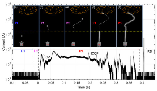 The schematic diagram for the development process of a negative rocket-triggered lightning flash at 0715:22 UTC on 2 July 2019 is shown in Figure 4, which marks three phases of a channel-base current during the initial stage—P1, the current pulse before the sustained upward leader is called precursory phase with tens of attempted leader inception; P2, the positive leader that develops upward while producing impulsive current pulses, which is called the phase of initial current pulse (ICP); and P3, when the positive leader develops upward to certain height, the resulting continuous current is called initial continuous current (ICC), which includes the initial current variation (ICV) related to the disintegration of steel wire and initial continuous current pulse (ICCP) superimposed on the ICC [3,7]. The yellow dotted line in Figure 4 is the altitude of leader inception, typically ranging from 150 to 350 m [17].