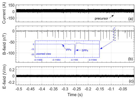 The channel-base current B-field at the close site and the E-field measured for the triggered lightning flash examined in this paper are shown in Figure 5a–c, respectively. The duration of the precursory stage is approximately 0.5 s. Due to the incomplete data acquisition, the E-field signal at the far site is not shown in Figure 5. There are a lot of precursor pulses marked in Figure 5a. With the threshold of 0.1 nT (about twice background noise level), the magnetic pulses of the precursor are divided into initial precursor pulses (IPPs) and subsequent precursor pulses (SPPs), as indicated in Figure 5b.