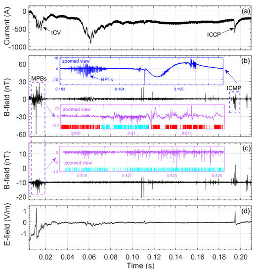 The initial continuous magnetic pulses (ICMPs) show very intensive pulses features at the initial stage of ICCP, which are shown in the blue zoomed view of Figure 7. Those intensive regular pulse trains (RPTs) correspond to the recoil leader process, which become the general form of lightning discharge in ICC [32,33]. After that, continuous current propagates down the leader channel and produces a slowly changing B-field. In addition, the slowly changing B-field is also superimposed with small magnetic pulses related to in-cloud discharges.