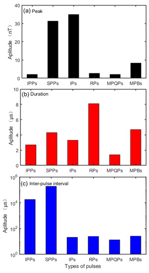 According to the different waveform characteristics mentioned above, the pulses at the initial stage are divided into six types, including—IPPs, SPPs, IPs, RPs, MPQPs, and MPBs. The results of the comparison of peak, duration and inter-pulse interval are shown in Figure 8.