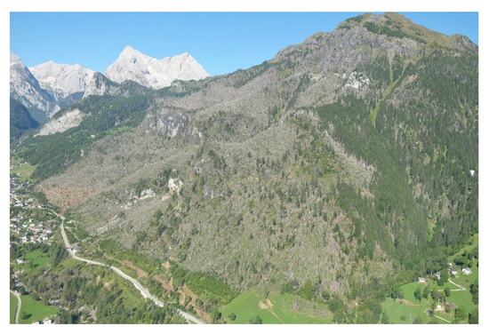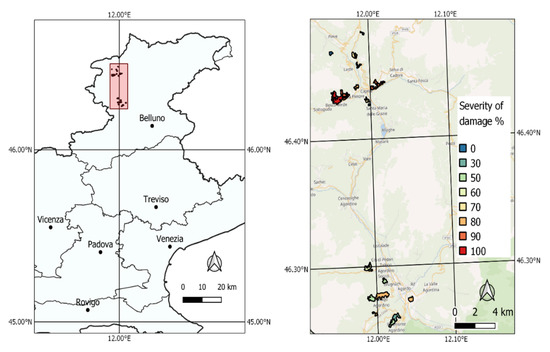 The cost of such damage can be very high in economic terms (e.g., €6 billion in France from storms Lothar and Martin in 1999, and around €1.9 billion in Sweden after the storm Gudrun in 2005) [10]. Further added impact on local communities and forest ecosystems must be also considered. On 29 October 2018, the Vaia storm and flood event hit North-Eastern Italy, causing damage to forests mainly located in Alpine areas of the following regions: Veneto, Trentino-South Tyrol, Friuli Venezia Giulia, and Lombardy. The average and maximum value of the high-intensity rainfall was 335 mm and 519 mm, respectively, over a single day, and the wind had peak wind speeds recording close to 200 km h−1 (SE direction). The storm caused extensive forest damage, completely uprooting trees in large areas or severely damaging forests of about 42,500 ha, with a first estimated volume of timber loss of 8.5 million cubic metres [11,12,13]. Some forest stands were completely blown down, probably because the wind was funneled into the Alpine valleys and increased speed by the orography [14], and the characteristics of forests make the stands more susceptible to windthrow (simple structure, monolayered, and monospecific Norway spruce stands). The Copernicus Emergency Mapping system reports only about 4000 ha of damaged areas, about 10% of the affected area, due to cloud cover presence in the optical images used for mapping [15]. Following the Vaia storm, the impacted regions assessed the forest damage by means of aerial photographs and very high-resolution optical satellite images with data from field surveys. Manual area digitalization was adopted, which resulted in complex interpretation due to mixed interpretations of degree of damage, in particular where many trees were left standing. In addition, the definition of boundaries are subjective, as often there is not a clearly defined margin between damaged and untouched forest.