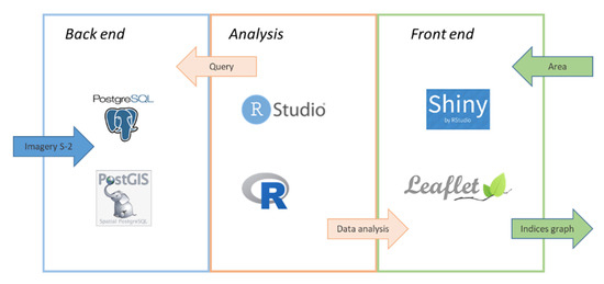 The structure of the web-GIS is composed of the back end, the analysis module, and the front end, as described in Figure 3. The satellite imagery and metadata are available through the Sentinel API Hub, so updated Level-2 images over the region of interest are automatically downloaded and stored as PostGIS elements in the PostgreSQL database. The data is kept in the original jp2 file format, and PostGIS stores meta-information (out_db option). The analysis module is based on R CRAN language, which connects the database with the front end. Therefore, the query can be launched by the user through the front-end interface that has been developed using Shiny and Leaflet packages. The user sets the parameters, which are the vegetation index, the areas drawn on the map, and the temporal window. In contrast, for the querying of the database, the threshold for the cloud coverage for each image is automatically set below 20%, and the cloud masking is automatically applied. The results are a colour-coded index map and a time-series plot (see Appendix A).