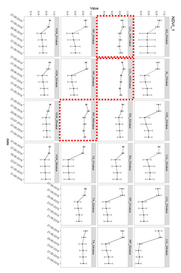 The NDVI temporal series for each plot area are reported in Figure 4. The control areas with no damage are named LCL_NW1, LCL_NW2, RP_NW (red outline), and clearly have stable NDVI values, as expected. The NDVI values in the damaged areas decrease clearly and the standard deviation increase e.g., the areas RP_03, RP_04. It is worth noting that in some damaged areas, such as the VOA_02, the NDVI values decrease to a lesser extent than other damaged areas, and the post-event values seem stable over 2019. Again, TA_01 and TA_02 both have 60% severity, but TA_01 has 10% understorey and NDVI of 0.44, TA_02 has 70% understorey and NDVI of 0.69. LCL_04 and CLS_03 are two forestry harvest area where the trunks have been removed. The soil is covered by woodchips mixed with herbaceous recovery; NDVI values in these two cases range from 0.33 to 0.59.