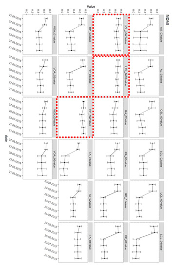 In conclusion, all indices except EVI1 and EVI2 can identify quite well the damaged areas. This is in line with results that report that EVIs give significant information on green biomass in non-degraded forests [43]. The visual plot of NDVI, RGI, and NDMI are easier to read and understand, and will be used for the web application. The VIs have been used for other disturbances such as bark-beetle infestation [25,33], which is a different case, but present a similar drop in photosynthetic material.