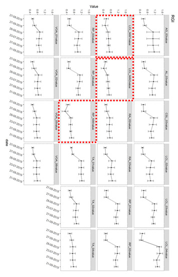 The relative greenness index (RGI) is an index of anthocyanin content [32], and it takes into consideration the response of the red band over the green band. Study results on this index bring evidence of a high correlation coefficient, from 0.7 to 0.9, between pixels covered with red-stage pest attack and the tree crown using a very high spatial resolution imagery e.g., ~1 m resolution or less. The epidemic red stage was studied in Canada using Landsat-TM imagery and applying the enhanced wetness difference index (EWDI) in a mixed forest [33]. The EWDI is calculated by subtracting the tasseled cap wetness index [34] of two images in different years. Again, the red-stage attack was studied by [35] using the normalized difference moisture index (NDMI). Wilson and Sader [36] found higher accuracies of NDMI over NDVI in change detection of forest harvest. Biotic and abiotic disturbances were studied considering the red-edge chlorophyll indices (CI) and NDVI for estimating the temporal change in leaf chlorosis and defoliators in [37].