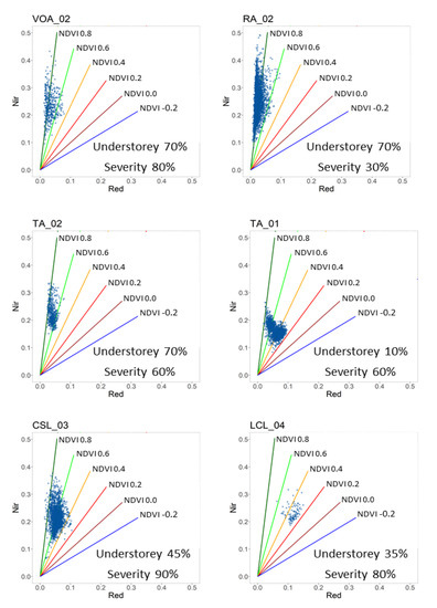 Detailed information about the effect of residual shrub cover and vegetation regeneration over NDVI at pixel scale can be observed in Figure 5. The figure shows red/nir spectral space with values of each pixel in the imagery. The points show the significant effect of post-event residual (shrub) and regenerated vegetation with the scatterplot and the NDVI baselines in September 2019. On one hand, the points of RA_02 and VOA_02 are compressed along the Y (red) axis. Both have the same shrub cover of 70%, but RA_02 site, with 30% severity, results in 0.81 value of NDVI, whereas VOA_02 has 80% severity, resulting in lower NDVI value of 0.74. In both cases, no information can be extracted about the recovery, because the NDVI value reflects vegetation that can be either from existing surviving shrub (understorey) or from recovery.