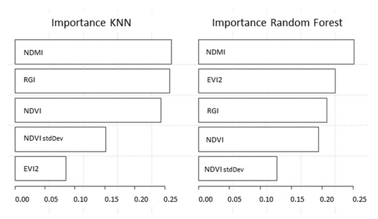 Regression with machine learning can be used to predict severity. The model parameters were tuned automatically using the Rminer package and a number of search equal to 10. Results were assessed using k-fold cross-validation, with k = 10. The regression error characteristic curve (REC), which describes the accuracy of the models, shows very similar results comparing RF, KNN, and SVM (Figure 7) with the former two having slightly better results. The differences between the first two algorithms are the importance of input variables. The most important input in both cases is NDMI, but RF takes advantage of EVI2 information to a greater degree. In contrast, KNN considers RGI as an important variable (Figure 8).