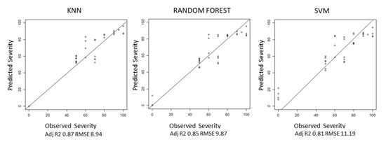 The severity was then predicted using KNN, RF, SVM algorithms, and a combination of indices over the testing (Figure 9). Results for the RF algorithm, calculated using the Rminer package, are reported in Table 3. NDMI is among the better predictors in our study for severity. It must be noted that NDMI is used in the literature for detecting water stress that can be caused by abiotic or biotic factors, e.g., water availability and pathogen attacks, respectively, and damaged trees reflect a similar spectral signature. It is therefore important to use NDMI when the causality can be identified specifically.