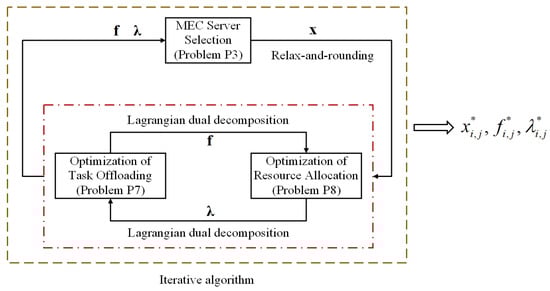 In this section, we decouple the multi-objective optimization problem as two subproblems, i.e., the MEC server selection problem and the task offloading problem. Then, as shown in Figure 4, we use the relax-and-rounding method and the Lagrangian dual decomposition method to solve it. Finally, we propose an efficient iterative algorithm by jointly considering the task offloading, the resource allocation, and the security assurance.