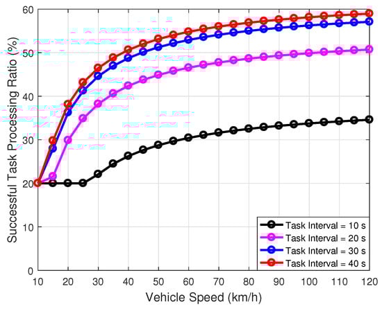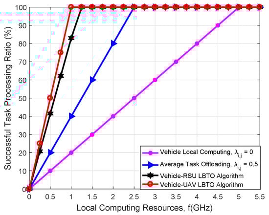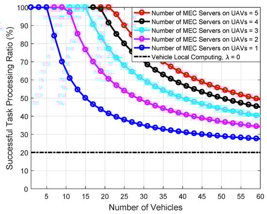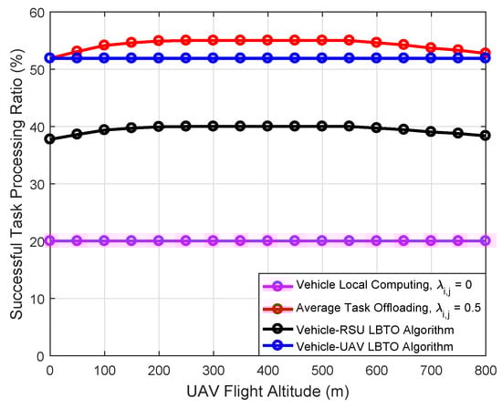 The simulation results show that the proposed LBTO algorithm achieves better performance than the other algorithms in terms of the successful task processing ratio and the task processing delay. In our designed LBTO algorithm, each vehicle can select one appropriate MEC server on UAV and offload parts of the computation task, which can achieve load balancing and service reliability improvement by the task scheduling among edge MEC servers on UAVs. Furthermore, these results fully show that our proposed LBTO algorithm is better than the benchmarking algorithms, and the schemes with optimized network parameters are superior to those without optimization.