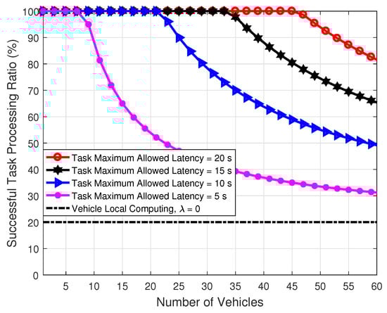 The MEC technique have been widely applied to improve the successful task processing ratio in VANETs [,,]. The MEC technique brings the computing ability and the storage resource to the edge of the network, which can enable the computing ability and the storage resource in close proximity to users. Therefore, the task offloading problem has been investigated in many researches in the context of VANETs [,,,]. In those works, the main objective is to minimize task processing delay by selecting the optimal MEC server, while the load balancing is not taken into account. Aiming at this problem, the authors of [,] focused on task offloading and execution utilizing the computing resources on vehicles to load balancing. Moreover, the works in [,,,] proposed to reduce task processing delay by offloading computation-heavy and latency-sensitive tasks to nearby RSUs or UAVs for remote execution. Furthermore, in [,,], the offloading problem was studied with an objective to minimize the weighted sum of mobile energy consumption for a multiuser UAV-assisted VANET. The work in [] designed a new system model where UAVs can offload and/or share intensive computation tasks with other nearby network nodes. Then, the authors of [] used the computation response time, the energy consumed for the computation, the cost of cellular communication, and the computation cost as the main system metrics to make any computation offloading/sharing decisions that optimized the system performance. The difference is herein we propose a MEC-enabled UAV-assisted VANETs architecture, based on which a number of vehicles are served by UAVs equipped with computational resources. Each vehicle has to offload its computing tasks to the proper MEC server on UAV due to the limited computation ability. In addition, we assume that each vehicle can only select one MEC server for computational offloading.