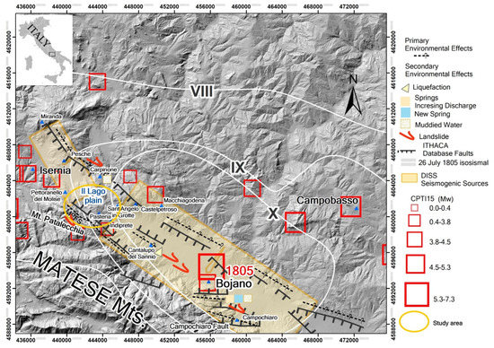 As mentioned, in historical times, the Bojano basin was the epicentral area of several high-magnitude seismic events: in 1456 [17,18] and in 1805 [18]) (Figure 1).