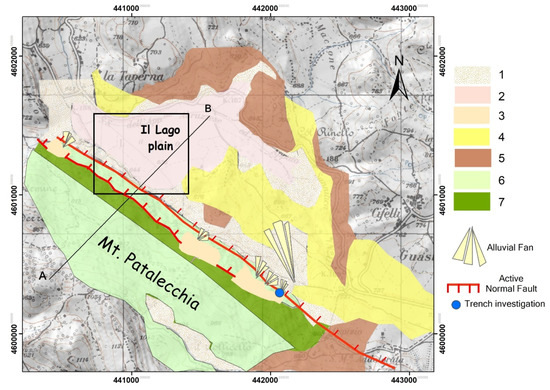 Geological sketch map of the investigated area: (1) colluvial and slope debris deposits (Holocene); (2) lacustrine deposits (Late Pleistocene to Holocene); (3) cemented limestone breccias (Middle to Late Pleistocene); (4) Calcarenites, calcilutites, and marly limestone (Serravallian–Tortonian); (5) marly limestone and marl (Oligocene–Burdigalian); (6) calcarenites and cherty limestones (Senonian-Turonian); and (7) Mesozoic limestone succession (Cenomanian–Early Turonian) modified after [16,49]. The black rectangle in the map is the area shown in Figure 3; the black line is the trace of the geological cross-section of Figure 14; the blue dot is the trench investigation site is from [27]. Easting and northing are UTM WGS 84.