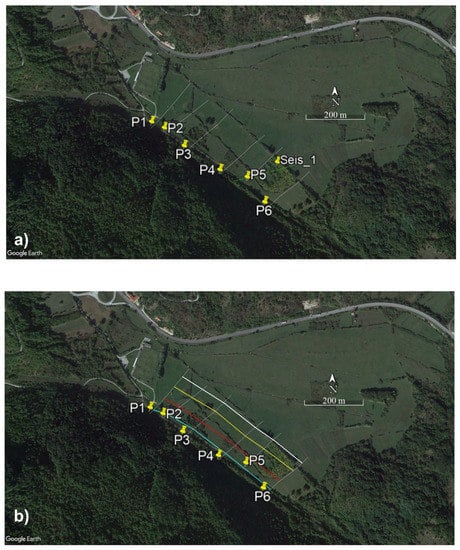 (a) Map of the seismic refraction (Seis_1) and GPR (from P1 to P6) profiles conducted at the “Il Lago” Plain (see the black box in Figure 2 for location); and (b) georeferenced localization of the identified structures associable to the fault system detected by GPR data. The solid light blue and yellow lines are the identified antithetic faults. The solid red and white lines are the identified synthetic faults (see Figure 13).