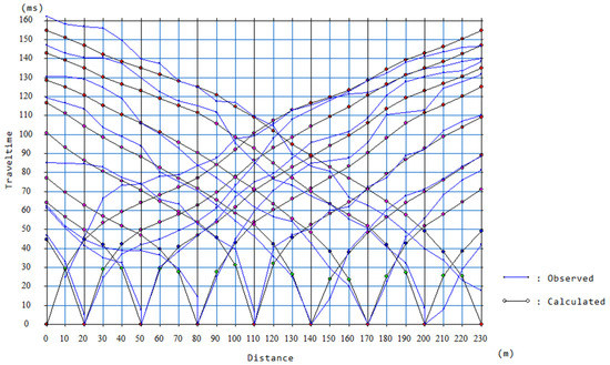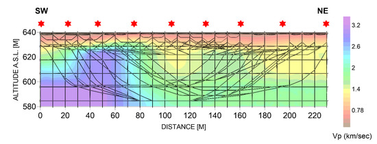 Results of the seismic tomography at the “Il Lago” Plain (profile Seis_1, Figure 3), with raytracing overlaid; the red stars are the shot positions.