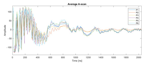 Figure 8 shows the raw data (B-scans) and the corresponding average trace for each scan. It can be seen how the radargrams are affected by undesired components, such as the signal due to the direct coupling between the Tx and Rx antennas and the measurement noise, which affects the useful part of the collected signal. More specifically, in the first part of time window, up to about 400 ns, each considered B-scan is affected by a strong phenomenon of direct coupling between the antennas, as also shown in the average traces in the right panels of Figure 8 and in their superposition in Figure 9.