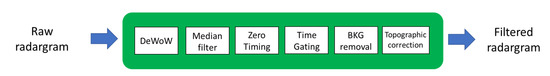Figure 10 shows the processing chain adopted to improve the interpretability of the considered GPR data. Specifically, the data processing involves the following procedures: