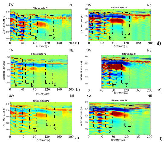 Figure 12 shows the six filtered radargram obtained by means of the data processing chain described in Section 3. The filtered data allow identifying three main areas, highlighted by three black dot-dashed rectangles (a–c in each panel of Figure 12), with strong reflections due to variations of the dielectric permittivity of the subsoil. More specifically, on the SW side of each filtered data section, we observe the reflective area (a) with a depth-to-the top of about 10 m (630 a.l.s.) and a lateral extension of about 25 m. This GPR anomaly ends with a new discontinuity that could be associated with the presence of a second change in the geological condition (black dashed rectangle b). Then, we note a third anomalous area between the distances of 100–130 m where a third geological structure is expected (black dashed rectangle c). The sequence of the three main anomalies (a–c) placed at a limited distance generally smaller than 50 m is well kept for all the radargrams acquired in the investigated foothills. Indeed, the results are similar despite the radargrams are distant up to 0.5 km, as in the cases of P1 and P6 that are the outer investigation lines.