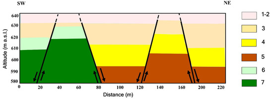 The above-mentioned tectonic regime favored the progressive development of fault slopes, well represented along the SW edge of the Bojano basin. The fault system of the “Bojano basin” consists of NW–SE normal synthetic and antithetic fault segments. They outcrop along the Matese Massif slopes and are also buried at the edges of the plain [21,27,34,35]. The buried faults acted as the main structure in the most ancient phases of the tectonic-sedimentary evolution of the area, causing the early phase of the Bojano basin opening and later transferring the tectonic activity to the piedmont faults. The NE-dipping system fault consists of five main segments ranging from 4 to 7 km for a total length of about 28 km (e.g., [15,16]). It includes the northeastern side of Mt. Patalecchia, the sector near the town of Cantalupo del Sannio, and the area between the towns of Bojano and Campochiaro (Figure 1). The outcropping Meso-Cenozoic bedrock is attributable to a depositional environment of carbonate platform/ramp and transition basin. It deposited in a stratigraphic interval ranging, in the study area, from the Upper Jurassic to the Middle Miocene. This is followed by calcareous-marly sediments of a neritic environment and by the calcarenitic-clayey-arenaceous sequences of foredeep from the Upper Tortonian to the Lower Messinian. The study area was involved in tertiary compressive deformation since the Upper Miocene; the folds and thrusts deriving from this tectonic phase were also subsequently displaced by strike–slip transfer faults. The present structural setting sees the carbonate bedrock sequence strongly dissected by variously oriented faults (N–S, E–W, NE–SW). These were superimposed by normal faults with an Apennine orientation (NW–SE), which are the result of the Quaternary and ongoing crustal extension. They may reactivate the discontinuities inherited from the previous tectonic phase. Long-term Quaternary normal displacement in the central part of these NE-dipping fault segments is up to 900 m, while Late Pleistocene to Holocene slip-rates have been estimated in 0.1 to 1.0 mm/year [15,16,27].