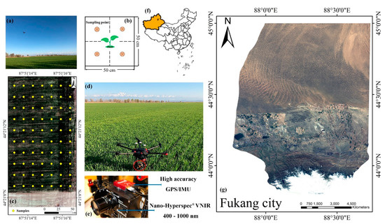 Overview of the study area and sampling: (a) application of the UAV; (b) four-point method of sampling; (c) sample point distribution; (d) UAV platform and airborne hyperspectral imaging sensor; (e) hyperspectral imaging sensor; (f) Xinjiang’s position in China; (g) geographical location of Fukang City.