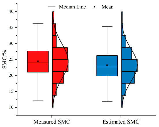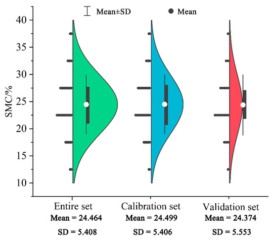 To identify the rationality of the sample division, the statistical distributions of the dataset for the entire set, calibration set, and validation set were assessed and illustrated in Figure 2. Overall, the sampling resulted in a mean of 24.45% and a standard deviation (SD) of 5.37%. The environment of the area in which crops were planted near the desert was a major influence, resulting in a relatively high SD value. The mean SMC values for the calibration and validation sets were 24.87% and 23.39%, respectively. The SD is usually understood as the degree of dispersion of the sample and the SD of the entire set was high, which may have been caused by the uneven spatial distribution of the SMC. Additionally, all datasets were normal distributions with similar statistical characteristics. The partitioning of the SPXY algorithm yields an analogous statistical distribution. In confirming valuable samples, potentially biased estimates were reduced as far as possible. Consequently, the two subsets were representative of the data as a whole.