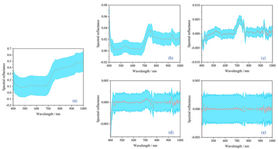 Results based on different FOD-preprocessed spectral curves. The red areas represent the SDs of the spectra: (a–e) the processing results from the orders of 0, 0.5, 1, 1.5, and 2.