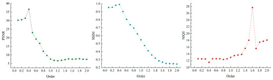 In addition to the above, PSNR, SSIM, and NIQE were also used to assess the effects of the images based on FOD (Figure 5). Upon comparing the IOD and FOD evaluation indicators, the image quality of the IOD was poorer than that of the low-frequency FOD. The values of the PSNR and SSIM increased gradually from the orders of 0.1 to 0.4, while the value of the NIQE decreased. However, their trends appeared to reverse the orders of 0.4 to 2. When the order was 0.4, the values of PSNR and SSIM were the smallest and the value of NQIE was the largest. These results indicated that the image quality of the 0.4-order approach was the best. Thus, the effect of low-frequency FOD technology on image quality was more obvious than that of high-frequency FOD technology.