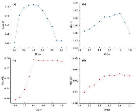 Max |r| and max GR at 21 derivative orders (0 to 2, with an increment of 0.1 per step): (a) max |r| for the orders of 0–1; (b) max |r| for the orders of 1.1–2; (c) max GR for the orders of 0–1; (d) max GR for the orders of 1.1–2.