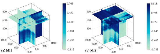 Optimal slice maps of the correlation coefficients between the SMC and the MI based on spectral bands. The color bars represent the correlation coefficients between the SMC and MIs, and the X-axes, Y-axes, and Z-axes are the respective wavelengths that represent the three bands of the MIs. The intersections of the three slices are the absolute maxima of the correlation coefficients: (a) MI1; (b) MI8.