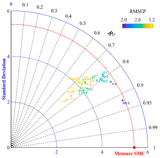 Taylor diagram of the estimated accuracy of each model. The black dotted line indicates R2val, the blue line indicates the SD, and the colored stars represent the 22 models, whose colors from dark blue to deep red indicate small to large RMSEP values. The red line represents the measured SMC.