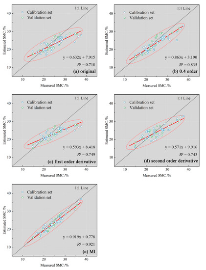 Meanwhile, compared with the 0.4 order model, strategy IV (MI model) generated the most reliable estimation in this study, and its performance was superior to that of the 0.4 order model (R2cal = 0.921, RMSEC = 1.956, R2val = 0.921, RMSEP = 1.943, and RPD = 2.736). Furthermore, the result of the MI model was close to the measured value. The results indicated that strategy IV produced the best performance in coupling spectral parameters and the SMC.