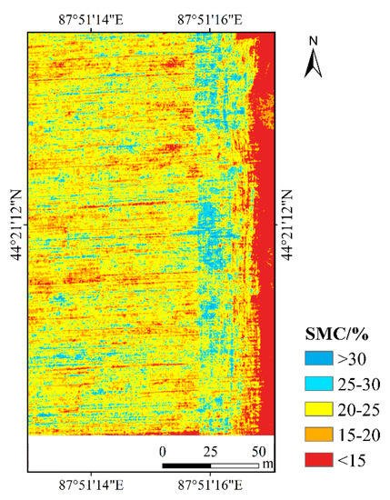 For the field scale, grid sampling was adopted as the main strategy according to the previous studies [74]. In April 2018, 70 points were selected through sampling cells (0.5 m × 0.5 m) for uniform data collection, in which the surveys were executed simultaneously via UAVs. The plant residue and gravel were removed from the top layer, after which the topsoil (top 10 cm) could be sampled. To make each sample representative, four soil subsamples were collected from four corners of 0.5 m × 0.5 m plant-centered quadrats and thoroughly commixed. Then, a small soil sampler was used to collect a portion of topsoil from each sample. The soil samples were rapidly sealed in aluminum boxes. Every sampling position was recorded using GPS (LT500T, CHC Navigation Technology Co. Ltd. Shanghai, China). The accuracy of GPS is approximately 1 m. The SMC was measured through the thermogravimetric technique (oven drying). This technique is the standard method for measuring SMC. With this technique, the weights of wet soil samples were measured first, then the wet soil samples were dried in the oven (105 °C, 48 h) and weighed. The differences between the two weights were calculated as the SMC.