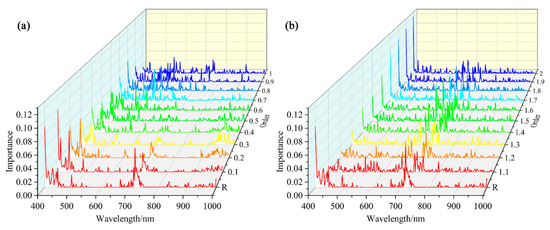 The importance of all bands for 21 derivative orders (0 to 2, with an increment of 0.1 per step). (a) the importance within 0-1 orders, (b) the importance within 1.1-2 orders.