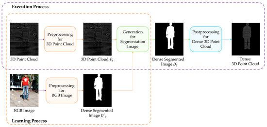 The execution process uses the learned DeepLabV3-Refiner model to construct a 3D point cloud with increased density. In order to input the learned DeepLabV3-Refiner model, the 3D point cloud is preprocessed. A dense segmented image is constructed from the learned DeepLabV3-Refiner model using . The post-processed image is defined as a dense 3D point cloud to convert into a 3D coordinate system.