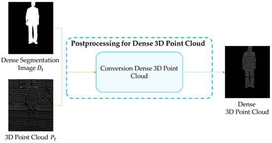 If the environment to be located is input, the accuracy of the dense 3D point cloud can be improved. In advance, a 3D point cloud is collected for the environment where the human will be located, and the depth image is defined as background . Then, and project the measured 3D point cloud onto a 2D plane to form a depth image, similar to the 3D point cloud preprocessing. In an environment where LiDAR does not move, it is possible to increase the accuracy of the segmented dense 3D point cloud by additionally inputting .