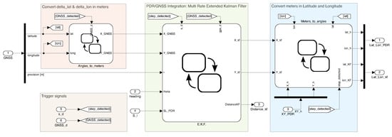 Figure 2 shows the Simulink diagram of the proposed GNSS/PDR system which assumes the GNSS data available at the initial time of the walk. The data generated by the accelerometer, gyroscope and magnetometer sensors are acquired at a sample rate of 100 Hz. This diagram illustrates the principal system blocks, from the data acquired by the sensors to the information provided as output: