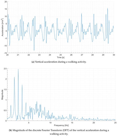 Representation in the time and frequency domains of the vertical acceleration during a walking activity. Vertical refers to the down direction of the NED frame.