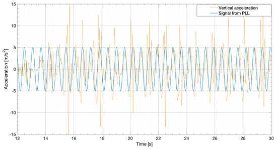 The vertical acceleration signal given to the PLL as input (orange line) and the signal provided by the PLL as output (blue line).