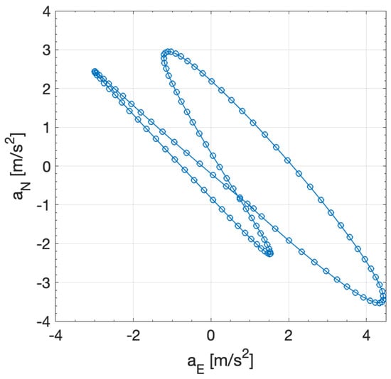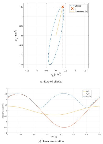 The heading angle is defined as the angle between the North direction and the motion direction of the person wearing the device. Estimating the motion direction is the most critical part of a pedestrian inertial navigation system due to the complexity of the body motion and the degrees of freedom of the human body. In fact, the walking motion, that can theoretically change at every single step, is not predictable. There are several ways to deal with this problem; for example, it is possible to fix the position of the inertial sensors in a rigid way at chest level or in a belt in order to be able to have a preferential direction of motion [14,15]. This drastically reduces the degrees of freedom of the system, but represents a situation that cannot be reproduced in a common scenario, in fact a phone is normally kept in a pocket or held in the hand during a walk or in an armband for running. For this reason, a system that is independent of the choice of the device location on body is needed. The considered method, which will be described below, exploits the fact that the acceleration data reported in NED frame can be used to determine the direction of motion. Considering the phone worn on the upper part of the leg, then the acceleration values in the North and East directions are related to the direction of motion and can be used to determine the heading angle. As reported in [13], by analyzing the accelerations on the North and East axes in the NED frame ( and ) at each couples of steps, it is possible to identify pseudo-ellipses, as shown in Figure 6.